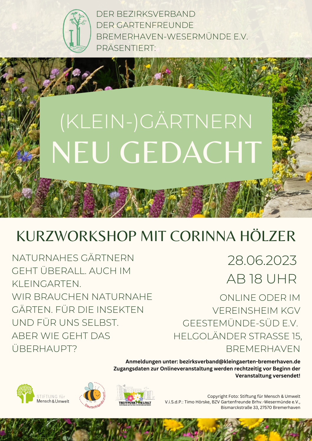 Kurzworkshop mit Corinna Hölzer von der Stiftung Mensch & Umwelt und der Aktion Deutschland summt zeigt allen Interessierten Einblicke in naturnahes Gärtnern. Zeit: 28.06.2023 ab 18:00 Uhr Ort: Vereinsheim des Kleingartenverein Geestemünde-Süd e.V., Helgoländer Straße 15, Bremerhaven oder Online per Videokonferenz Da die Plätze begrenzt sind, wird um Anmeldung unter bezirksverband@kleingaerten-bremerhaven.de gebeten. Die Zugangsdaten zur Videokonferenz erhalten angemeldete Teilnehmer kurz vor der Sitzung per E-Mail zu gesandt. Die Veranstaltung wird gefördert durch den Magistrat der Stadt Bremerhaven .